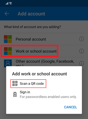 Tap Add account (or the + icon) → Work or school account.